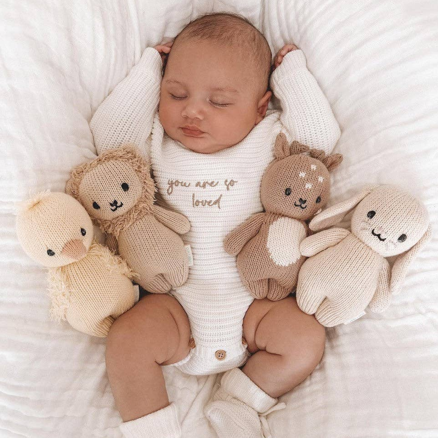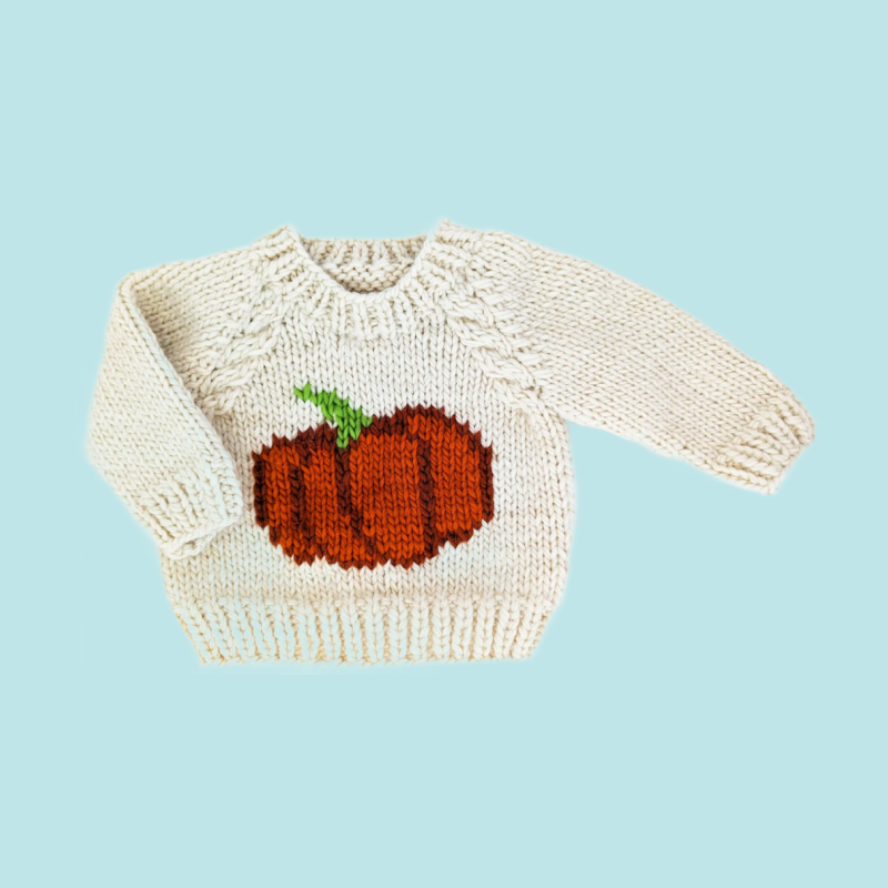 Perfect for the pumkin patch and fall adventures, this crew neck sweater has a big orange pumpkin on the front. Hand-knit with cozy Natural hued yarn, this has cable trim raglan sleeves and a softly knit neck, making it easy to put on your baby. The sweater is soft and warm, perfect for any little person. Match it up with one of our cute pumpkin beanie hats for a fun set.