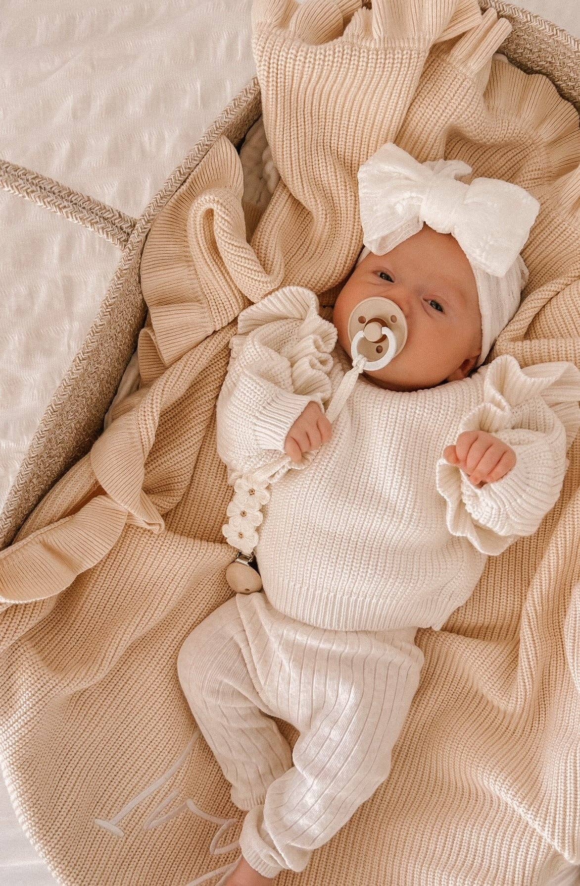 This is the set for the moments that matter most. Christenings, blessing days, newborn photo sessions, coming home from the hospital — the Deluxe Milk White Pointelle set rises to every occasion. The lace cuff booties complement the pointelle texture perfectly, creating a cohesive look that's breathtaking in photos.
