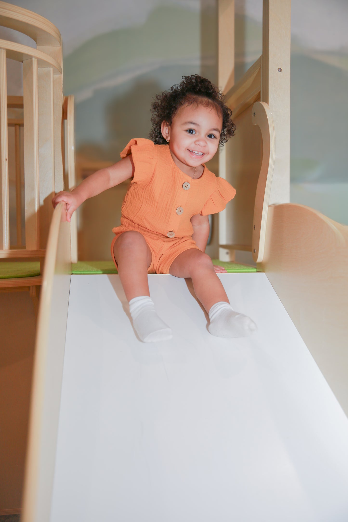 Size & Care: The Lucy romper runs true to size with a relaxed fit for comfortable play. GOTS certified organic cotton muslin gets softer with every wash. Machine wash cold, tumble dry low. The Lucy is also available in Soft Sherbert, Thistle, and Sage.