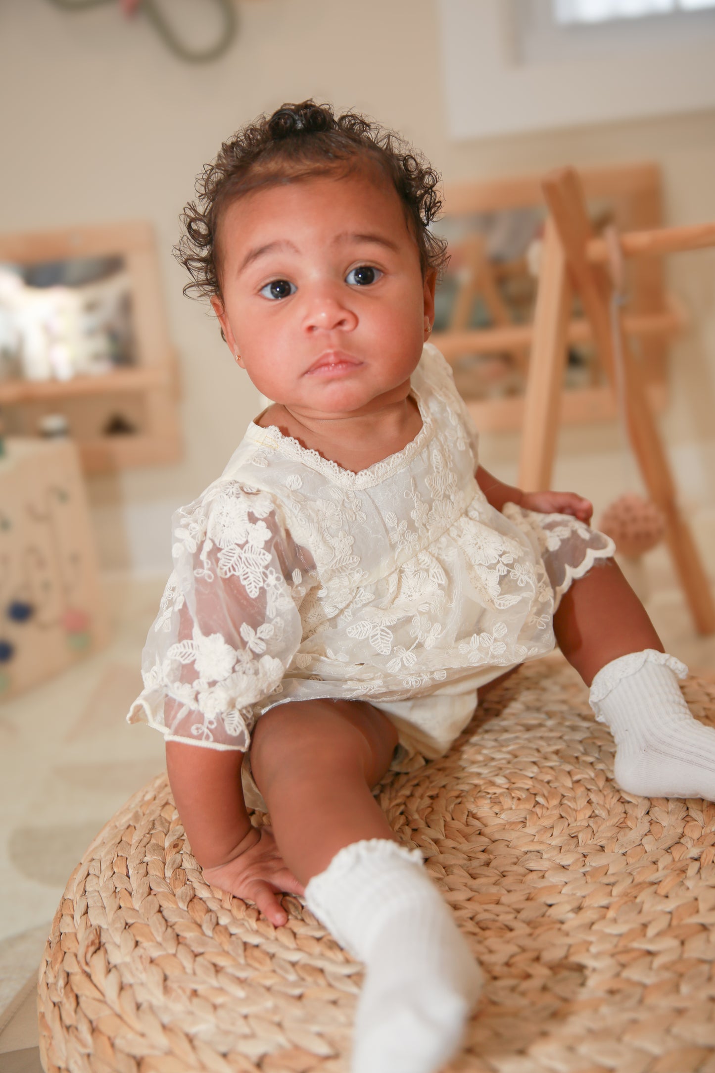 Size & Care: Available in 6M, 12M, 18M, and 24M. Machine wash cold, tumble dry low. This baby girl lace romper pairs beautifully with a bow headband and soft booties for a complete look.