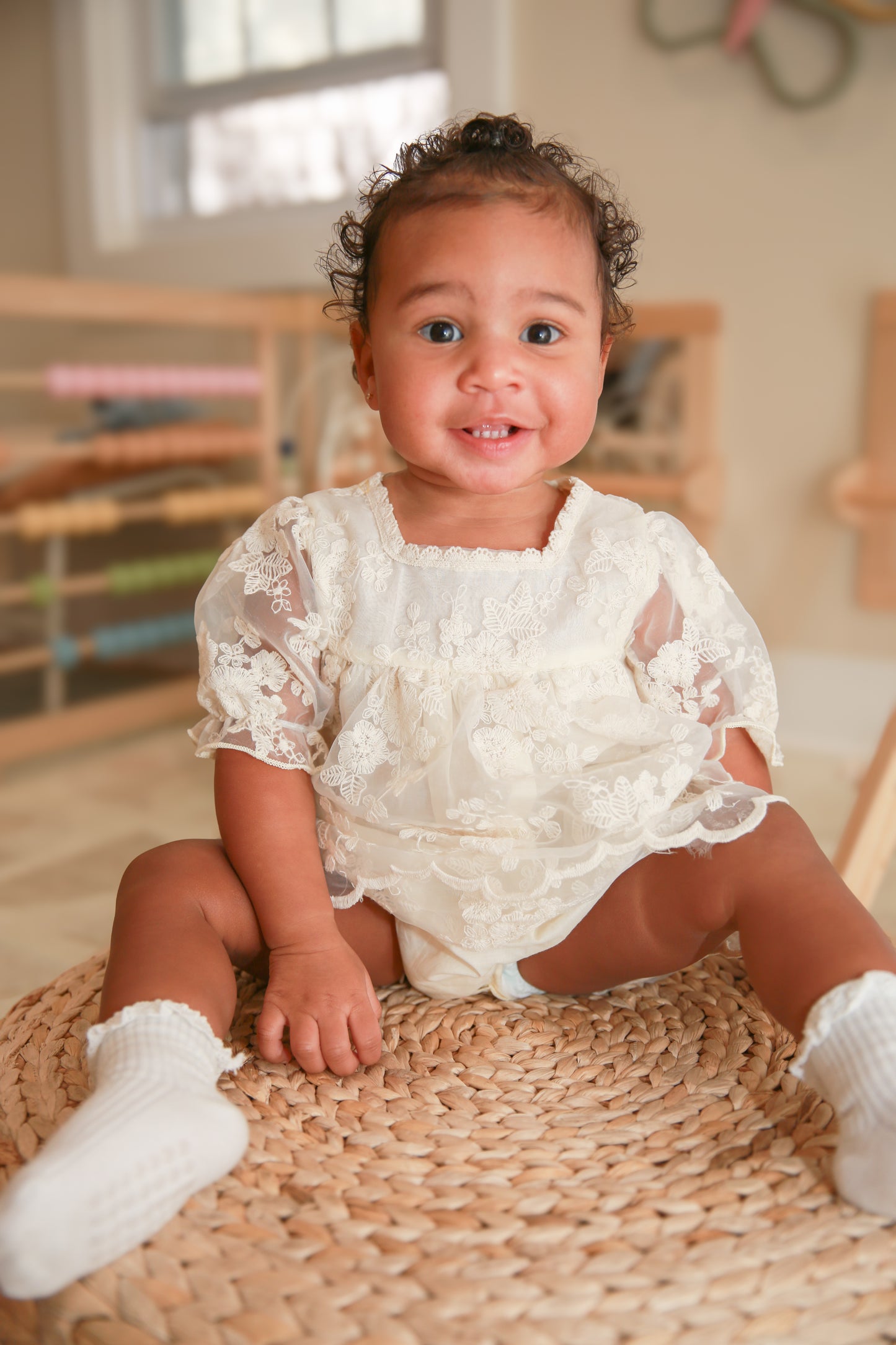 - Lace Ruffle Details — Delicate ruffle trim at the neckline and legs for extra sweetness
