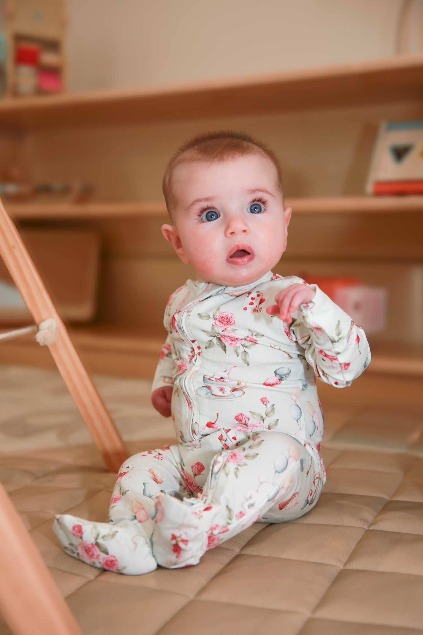 Introducing our White Rabbit Organic Snuggle Sleepsuit Zip Footie—a dreamy, all-in-one footed sleepsuit featuring Snuggle Hunny's exclusive White Rabbit print from the Celebrate 10th Birthday Collection. Hand-painted teacups, rabbits, balloons, macarons, and more on a soft pale sage base make this limited-edition design as enchanting as it is practical for bedtime, naptime, or cozy days at home.