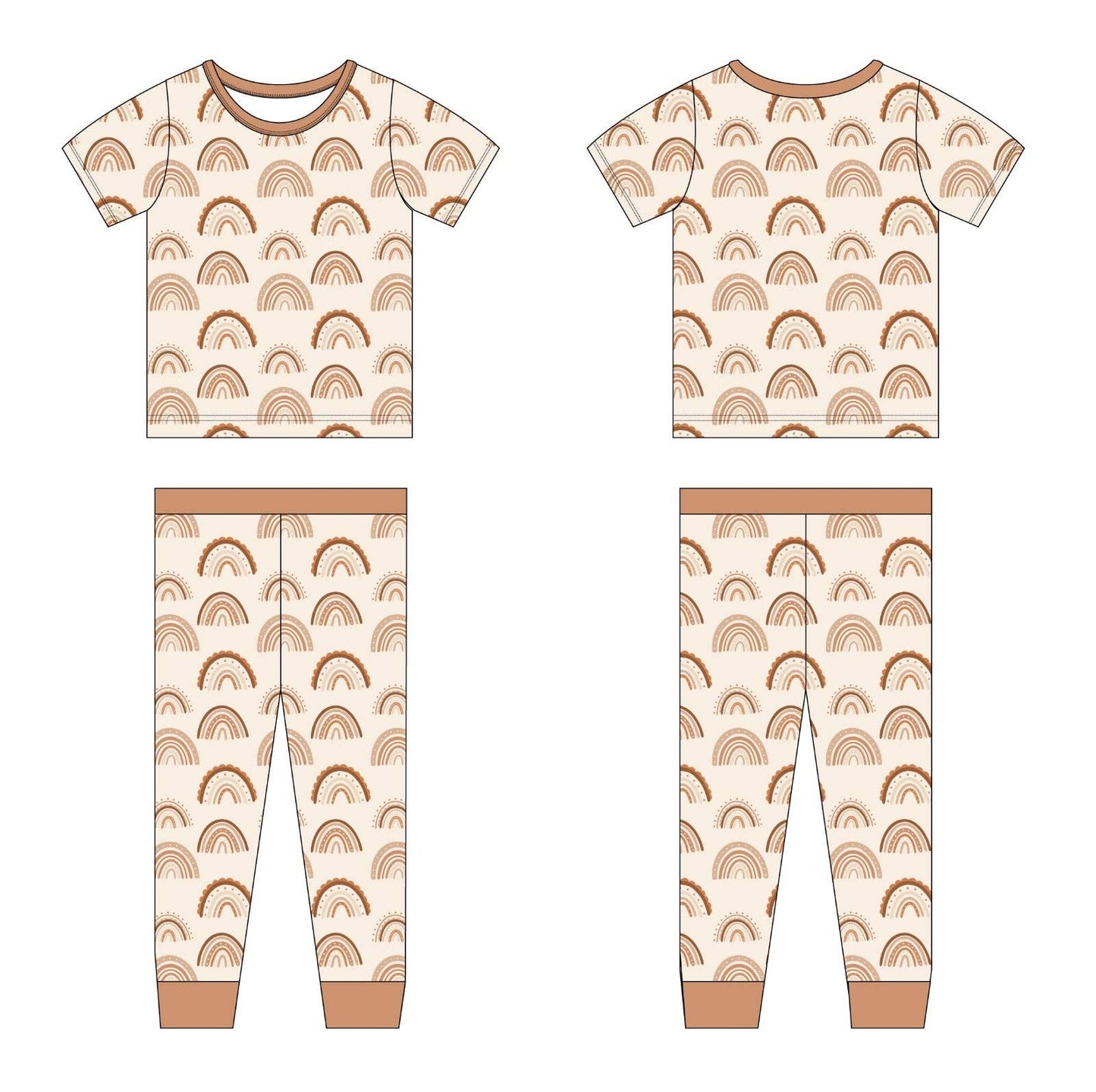 Boho Rainbow Two-Piece Bamboo Pajama Set by Joan's — a cozy matching top and pants set crafted from sustainably sourced bamboo viscose featuring unique hand-drawn boho rainbow prints that celebrate nature and spark imagination. These ultra-soft pajamas deliver breathable, moisture-wicking comfort for blissful bedtimes and lazy weekend mornings.