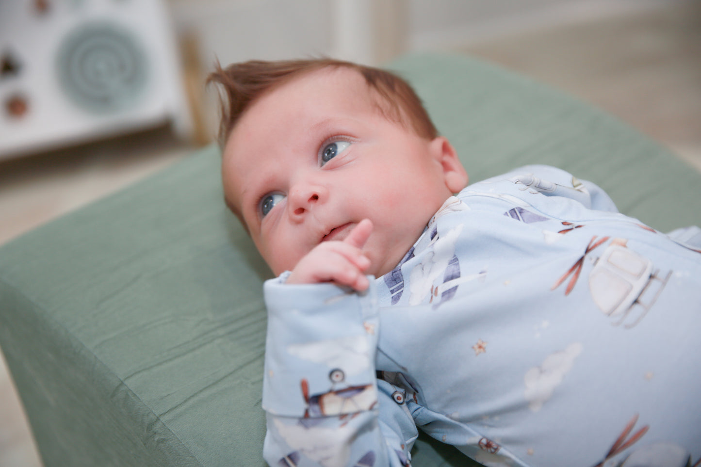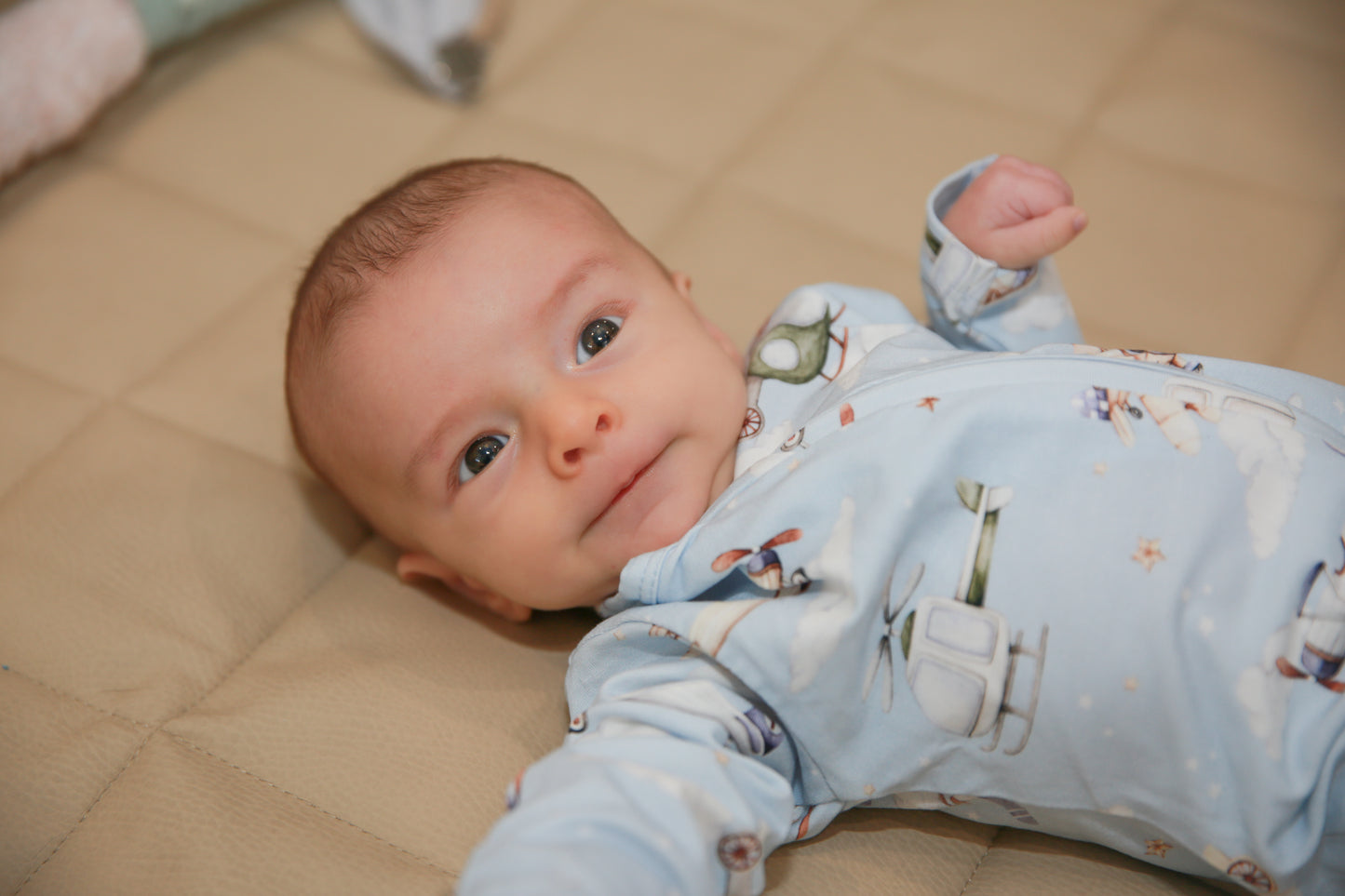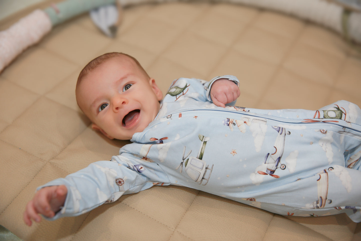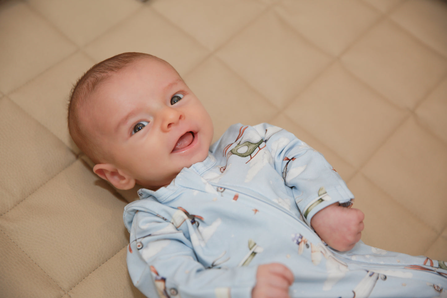 Premium Material: SnuggleSoft™ GOTS-certified organic cotton —buttery soft, breathable, stretchy, and hypoallergenic for delicate skin. Adorable Design: Taking Flight print—playful, adventurous charm that's photo-ready and timeless. Convertible Style: Fold-over feet + two-way zipper—effortless transition from sleeper to romper. Newborn-Friendly: Fold-over mittens (NB-6M) for scratch protection and warmth; fitted yet flexible fit. Versatile Essential: Ideal for daywear, sleep, photos, announcements, or gifting—machine washable for real-life parenting.